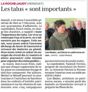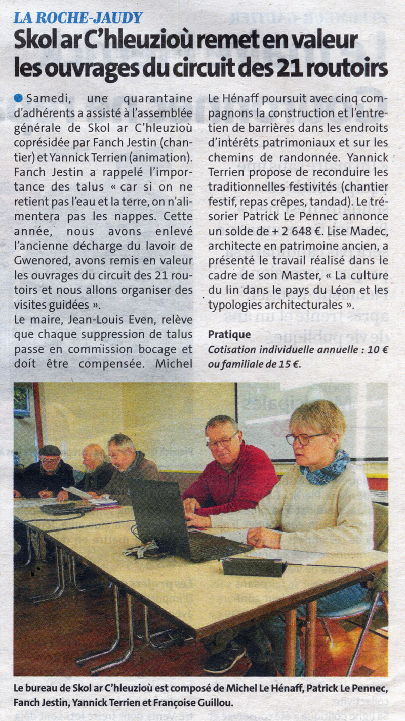 Actu 2025 La Roche-Jaudy : les talus « sont importants » 19 décembre 2025 Skol_ar_Chleuziou Samedi matin 13 décembre 2025 s’est tenue l’AG de l’association Skol ar C’hleuzioù. Photos et montages © Patricia Henry. Ouest-France du 18 décembre 2025. Le Télégramme du 18 décembre 2025.
